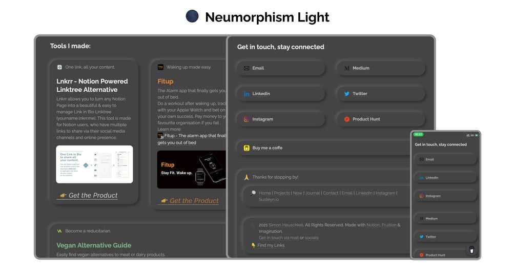 Neumorphism Light/Dark Design Template - Made for Fruition based Notion Websites