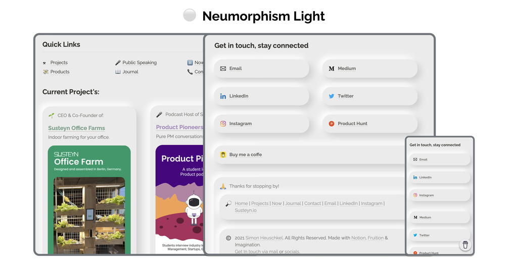 Neumorphism White / Dark Design Templates - Made for Fruition based Notion Websites