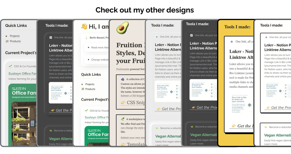 - In the process I created nine beautiful and different design themes for everyone who uses Fruition for their Notionwebsite.